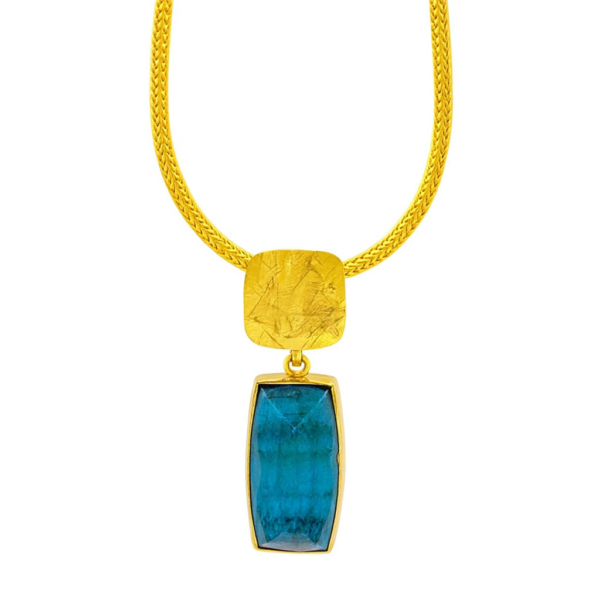 Το κολιέ “Aurora” είναι κατασκευασμένο από Ασήμι 925 και επιχρυσωμένο με διπλή στρώση χρυσού Κ18. Η χρυσή αλυσίδα, με υφή πλέγματος, φιλοξενεί ένα τετράγωνο μεταλλικό στοιχείο με ανάγλυφη επιφάνεια, από το οποίο κρέμεται μία ορθογώνια ορυκτή πέτρα απατίτη, ενώνοντας έτσι τη γεωμετρική καθαρότητα με την ένταση του χρώματος.