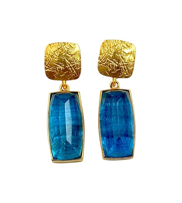Τα σκουλαρίκια “Aurora” είναι κατασκευασμένα από Ασήμι 925 και επιχρυσωμένα με διπλή στρώση χρυσού Κ18. Ο λοβός διακοσμέιται με ένα τετράγωνο χρυσό διακοσμητικό στοιχείο με ανάγλυφη επιφάνεια, από το οποίο κρέμεται μία ορθογώνια ορυκτή πέτρα απατίτη, ενώνοντας έτσι τη γεωμετρική καθαρότητα με την ένταση του χρώματος.
