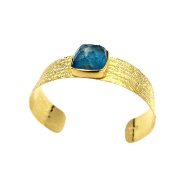 Το βραχιόλι “Aurora” είναι κατασκευασμένο από Ασήμι 925, επιχρυσωμένο με διπλή στρώση χρυσού Κ18 και διαθέτει πολύτιμο λίθο απατίτη. Το φαρδύ μεταλλικό σώμα του βραχιολιού διαθέτει σφυρηλατημένο φινίρισμα, προσδίδοντας μια rustic και αυθεντική αισθητική, ενώ η τετράγωνη πολύτιμη πέτρα σε βαθύ μπλε χρώμα δημιουργεί δυναμική αντίθεση με το χρυσό μέταλλο.