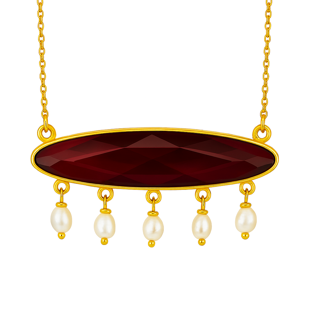 Το κολιέ “Claire” είναι κατασκευασμένο από Ασήμι 925 και επιχρυσωμένο με διπλή στρώση χρυσού 24Κ. Το κόσμημα διακοσμείται με γρανάδα σε σχήμα οριζόντια ναβέτα και στο κάτω μέρος είναι κρεμασμένα φυσικά μαργαριτάρια, προσθέτοντας διακριτική λάμψη και premium αισθητική.