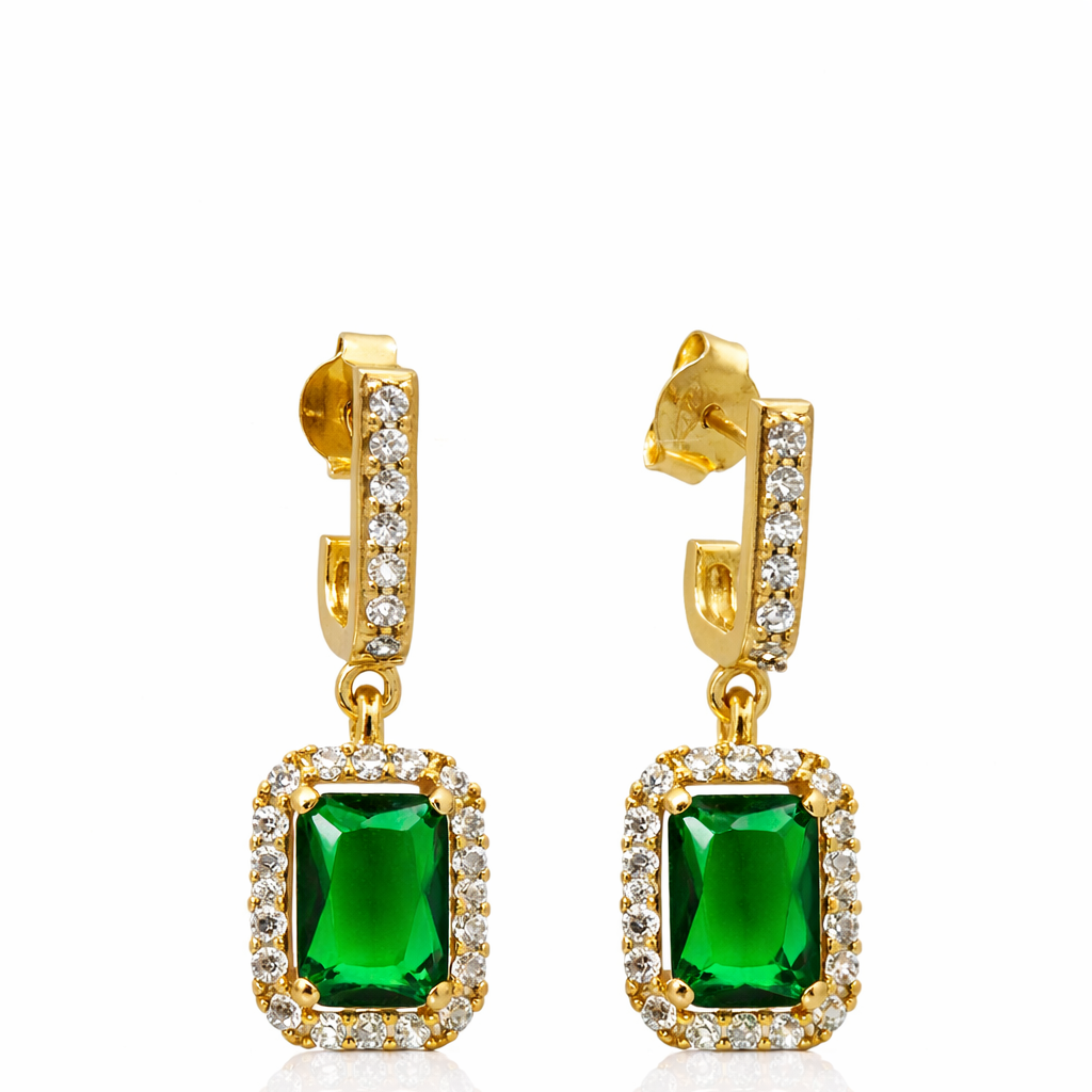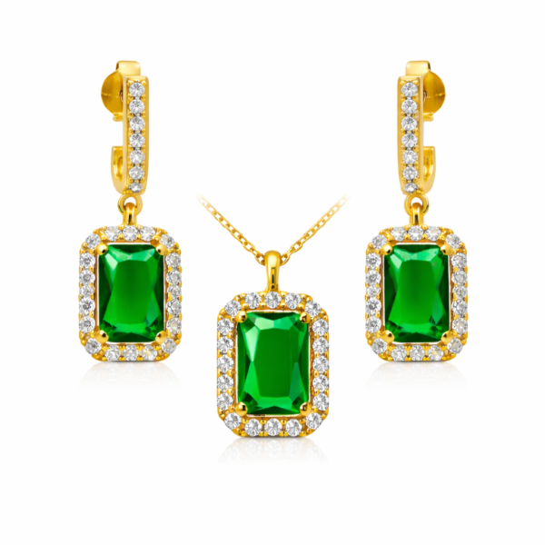 Στο κέντρο κάθε κοσμήματος δεσπόζει ένα ορθογώνιο ζιργκόν στο χρώμα του σμαραγδιού, το οποίο προσδίδει ένταση, βάθος και αίσθηση πολυτέλειας. Το πράσινο ζιργκόν πλαισιώνεται από λαμπερά λευκά ζιργκόν, τοποθετημένα περιμετρικά, δημιουργώντας ένα εκλεπτυσμένο φωτοστέφανο που αναδεικνύει τη λάμψη και το χρώμα της κεντρικής πέτρας.