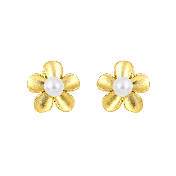 Τα λουλούδια αποπνέουν φρεσκάδα και φυσική ομορφιά, ενώ το μαργαριτάρι στο κέντρο προσθέτει μια λάμψη και αίσθηση πολυτέλειας. Το χρυσό φινίρισμα στα πέταλα ενισχύει τη θηλυκή φύση του κοσμήματος και κάνει το σκουλαρίκι ευέλικτο σε συνδυασμούς, καθώς μπορεί να φορεθεί με λευκό, παστέλ ή πιο σκούρο ντύσιμο.