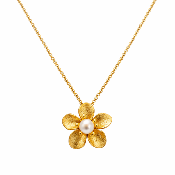 Τα λουλούδια αποπνέουν φρεσκάδα και φυσική ομορφιά, ενώ το μαργαριτάρι στο κέντρο προσθέτει μια λάμψη και αίσθηση πολυτέλειας. Το χρυσό φινίρισμα στα πέταλα ενισχύει τη θηλυκή φύση του κοσμήματος και κάνει το κολιέ ευέλικτο σε συνδυασμούς, καθώς μπορεί να φορεθεί με λευκό, παστέλ ή πιο σκούρο ντύσιμο.