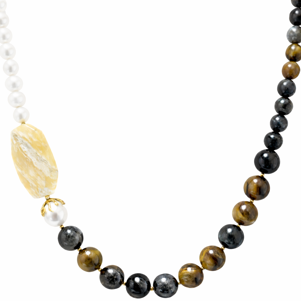 Το σχέδιο συνδυάζει φυσικά μαργαριτάρια με πολύτιμη πέτρα μάτι του τίγρη και πέτρα αχάτη στο κολιέ, δημιουργώντας μια εκλεπτυσμένη αντίθεση ανάμεσα στη διακριτική λάμψη των μαργαριταριών και τους γήινους, καφέ-χρυσαφένιους τόνους των πετρών. Το μάτι του τίγρη, γνωστό για το χαρακτηριστικό του «νεύρο» και τη μεταξένια γυαλάδα του, προσθέτει βάθος και δυναμισμό στο σύνολο, ενώ τα μαργαριτάρια προσφέρουν διαχρονική κομψότητα και θηλυκότητα.