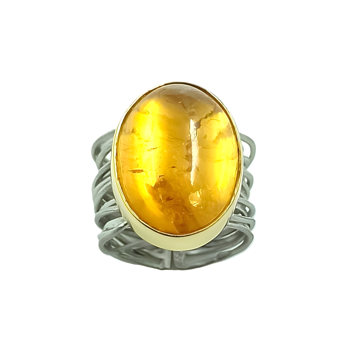 Η γάμπα του δαχτυλιδιού είναι χειροποίητα διαμορφωμένη σε περίτεχνη, πλεγμένη δομή από ασήμι 925, θυμίζοντας ανάγλυφα κλαδιά που αγκαλιάζουν τον πολύτιμο λίθο. Αυτό το οργανικό σχέδιο χαρίζει στο κόσμημα αίσθηση κίνησης και φυσικής ροής, ενώ ταυτόχρονα προσφέρει σταθερότητα και άνετη εφαρμογή. Η αντίθεση της ματ υφής της γάμπας με τη γυαλιστερή στεφάνη του Σιτρίν δημιουργεί ένα εκλεπτυσμένο παιχνίδι φωτός, ενισχύοντας την τρισδιάστατη εμφάνιση του δαχτυλιδιού.