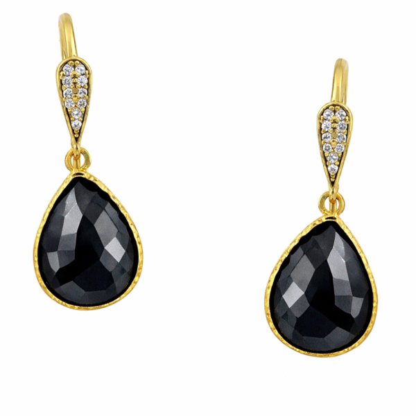 Τα σκουλαρίκια “Lumira” είναι κατασκευασμένα από Ασήμι 925 και επιχρυσωμένα με διπλή στρώση χρυσού Κ18. Η χρυσή καμπύλη που αγκαλιάζει απαλά τον λοβό, είναι διακοσμημένη με λευκές πέτρες ζιργκόν και καταλήγει σε μια ορυκτή πέτρα αιματίτη σε σχήμα δάκρυ, ενώνοντας τη μινιμαλιστική γεωμετρία με την αιθέρια κομψότητα.