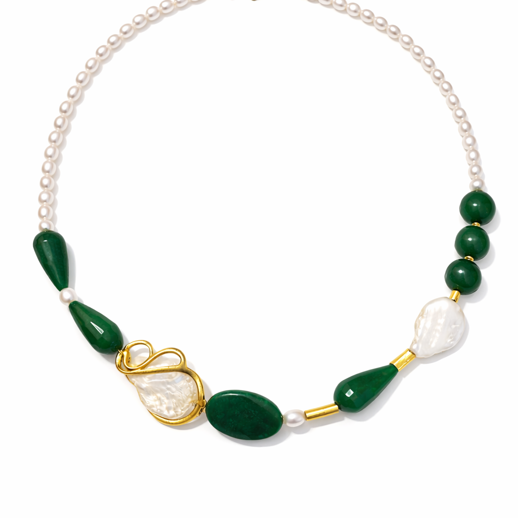 Χειροποίητο κολιέ από Ασήμι 925  με πέτρες πράσινου αχάτη, φυσικά μαργαριτάρια και επιχρυσωμένες λεπτομέρειες. Οργανική υφή και γλυπτική ισορροπία.