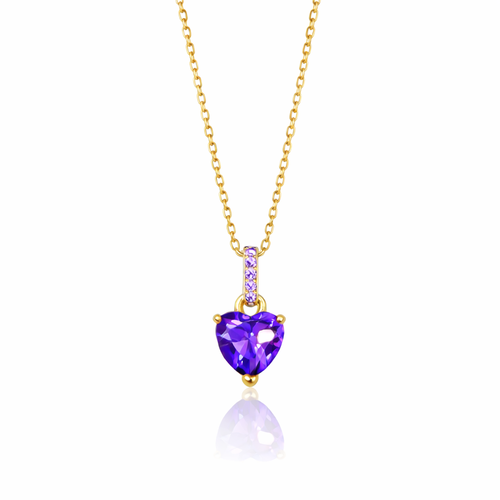 Λαμπερό κολιέ από επιχρυσωμένο Ασήμι 925 με καρδιά και μωβ πέτρες ζιργκόν. Κομψό κόσμημα που συμβολίζει την αγάπη. Ιδανικό δώρο.