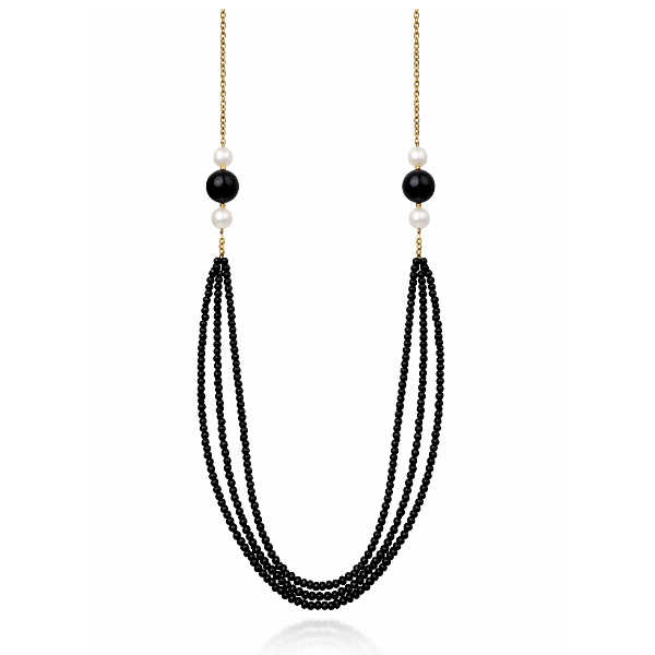 Το κολιέ “Noiré” είναι κατασκευασμένο από Ασήμι 925, διαθέτει πέτρες μαύρου όνυχα, φυσικά μαργαριτάρια και επιχρυσωμένες λεπτομέρειες και αλυσίδα με διπλή στρώση χρυσού Κ18.
