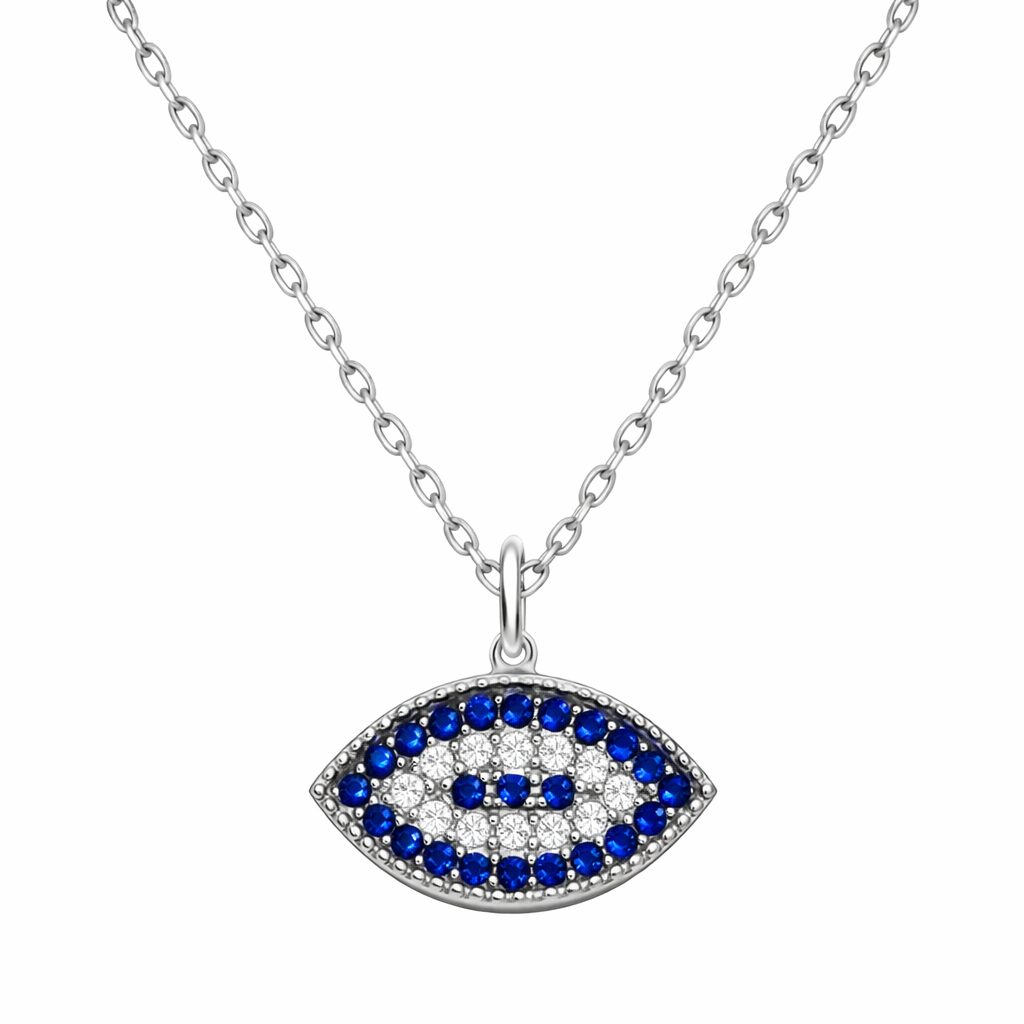 Το κολιέ “Nova Eye” είναι κατασκευασμένο από Ασήμι 925, έχει σχήμα ματιού και διαθέτει λευκές και μπλε πέτρες ζιργκόν, οι οποίες προσδίδουν λάμψη και αίσθηση πολυτέλειας στο κόσμημα.