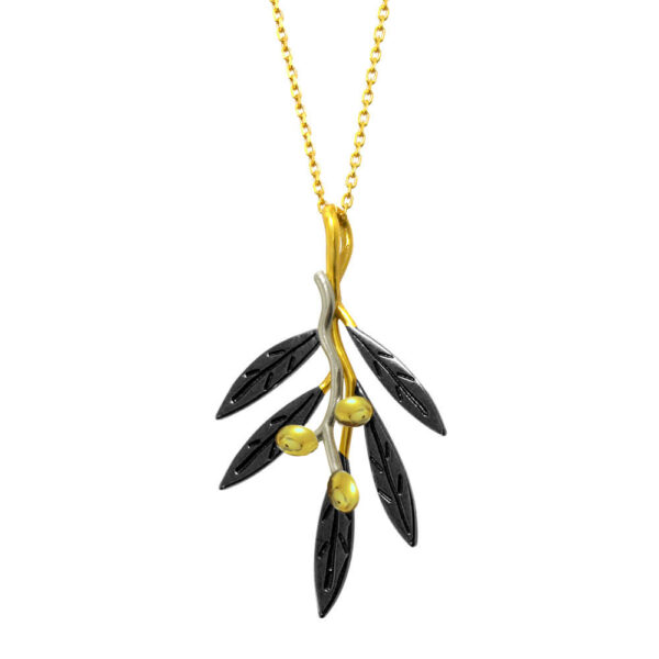 Κομψό χειροποίητο κολιέ ελιάς από επιχρυσωμένο ασήμι 925 και στοιχεία μάυρης πλατίνας. Φυσική και διακριτική λάμψη για καθημερινή και επίσημη χρήση.