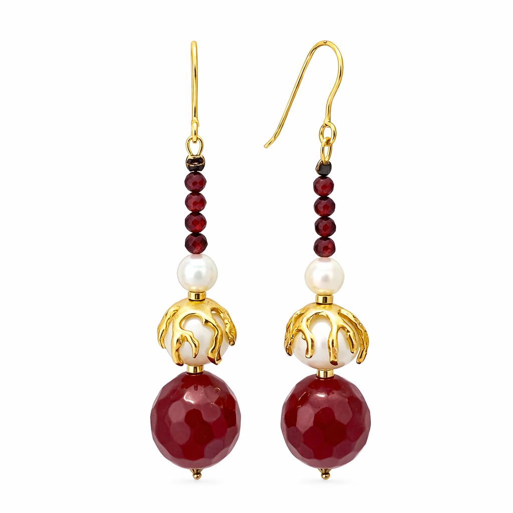 Χειροποίητα σκουλαρίκια από Ασήμι 925 με πέτρες κόκκινου αχάτη, γρανάδας, μαργαριτάρια και επιχρυσωμένες λεπτομέρειες. Οργανική υφή και γλυπτική ισορροπία.