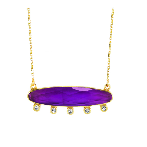 Το κολιέ “Purple Dream” είναι κατασκευασμένο από Ασήμι 925. Το κόσμημα διακοσμείται με ορυκτή πέτρα αμέθυστου σε σχήμα οριζόντια ναβέτα και στο κάτω μέρος είναι τοπθετημένες πέτρες ζιργκόν, προσθέτοντας διακριτική λάμψη και premium αισθητική.