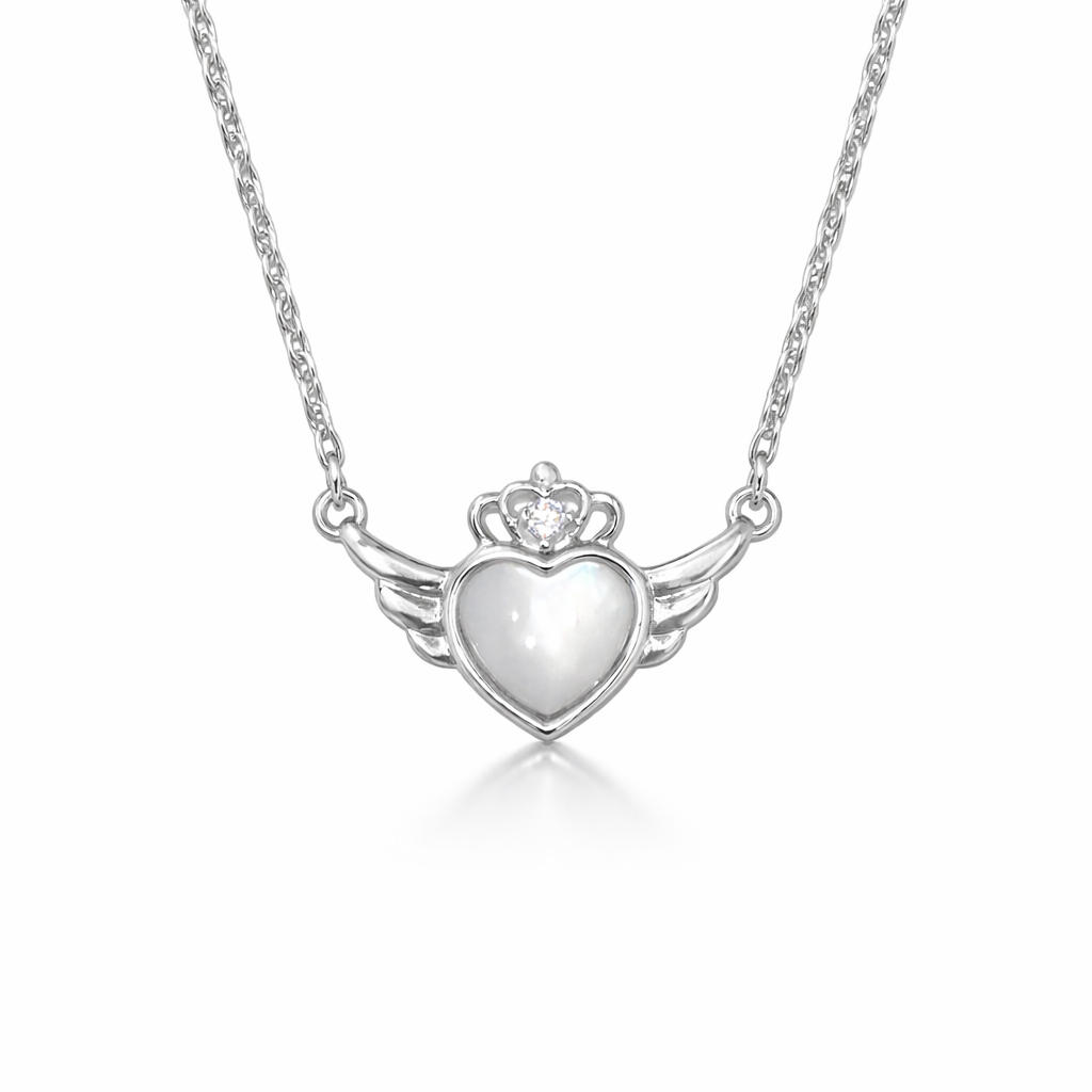 Το κολιέ “Queen of my Heart” είναι κατασκευασμένο από Ασήμι 925 και ξεχωρίζει με τον μοναδικό του σχεδιασμό, εμπνευσμένο από καρδιά με φτερά, κορώνα και ζιργκόν. Επίσης, η μικρή λευκή ζιργκόν στο εσωτερικό της καρδιάς, προσδίδει λάμψη και φινέτσα στο κόσμημα.