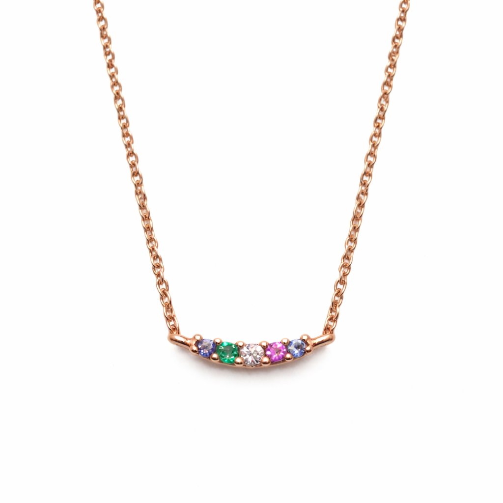 Το κολιέ “Rainbow” είναι κατασκευασμένο από Ασήμι 925, επιχρυσωμένο με ροζ χρυσό και έχει πολύχρωμες πέτρες ζιργκόν σε σειρά.