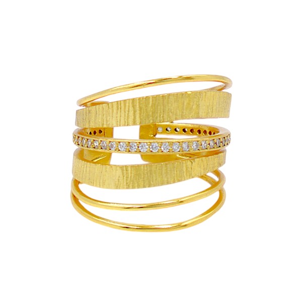 Το δαχτυλίδι “Spiral Gleam” είναι κατασκευασμένο από Ασήμι 925 και επιχρυσωμένο με διπλή στρώση χρυσού Κ18. Αποτελείται από λεπτές βέργες, που ενώνονται και η μία διακοσμείται με λευκές πέτρες ζιργκόν σε γραμμική διάταξη. Επίσης, το δαχτυλίδι ξεχωρίζει με την ματ υφή που έχουν δυο επιφάνειές του.
