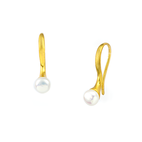Τα σκουλαρίκια “Vicky” είναι κατασκευασμένα από Ασήμι 925 και επιχρυσωμένα με διπλή στρώση χρυσού Κ18. Η χρυσή καμπύλη αγκαλιάζει απαλά τον λοβό, καταλήγοντας σε ένα λευκό μαργαριτάρι με φυσική λάμψη, ενώνοντας τη μινιμαλιστική γεωμετρία με την αιθέρια κομψότητα.