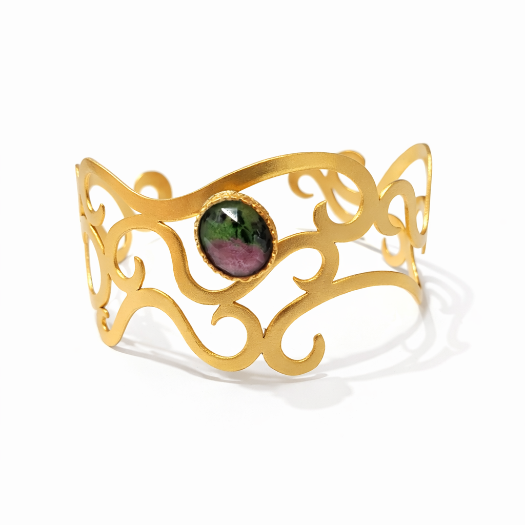 Το βραχιόλι “Zoiselle” είναι κατασκευασμένο από Ασήμι 925, επιχρυσωμένo με διπλή στρώση χρυσού Κ18 και διαθέτει οβάλ πολύτιμο λίθο στο κέντρο του. Η περίτεχνη χρυσή βάση του αποτελεί το φόντο σε μία πέτρα ρουμπίνι – ζωϊσίτη προσθέτοντας πολυτέλεια σε αυτο το μοναδικό κόσμημα.
